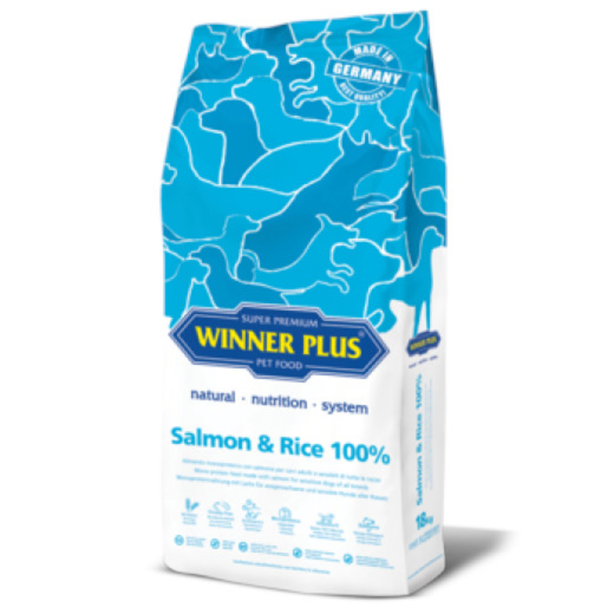 WINNER PLUS Salmon & Rice 100% es un alimento hypoalergénico ideal para perros adultos de todas las razas creado para ofrecer una dieta mono proteíca alternativa a la carne. Preparado con salmón de primera calidad, y controlado con los mismos estándares utilizados para humanos, particularmente adecuado para perros sensibles o perros con problemas digestivos. Los ácidos grasos Omega-3 y Omega-6, contenidos en el salmón de primera calidad (la única fuente de proteína animal), promueven una piel sana y un pelaje brillante.