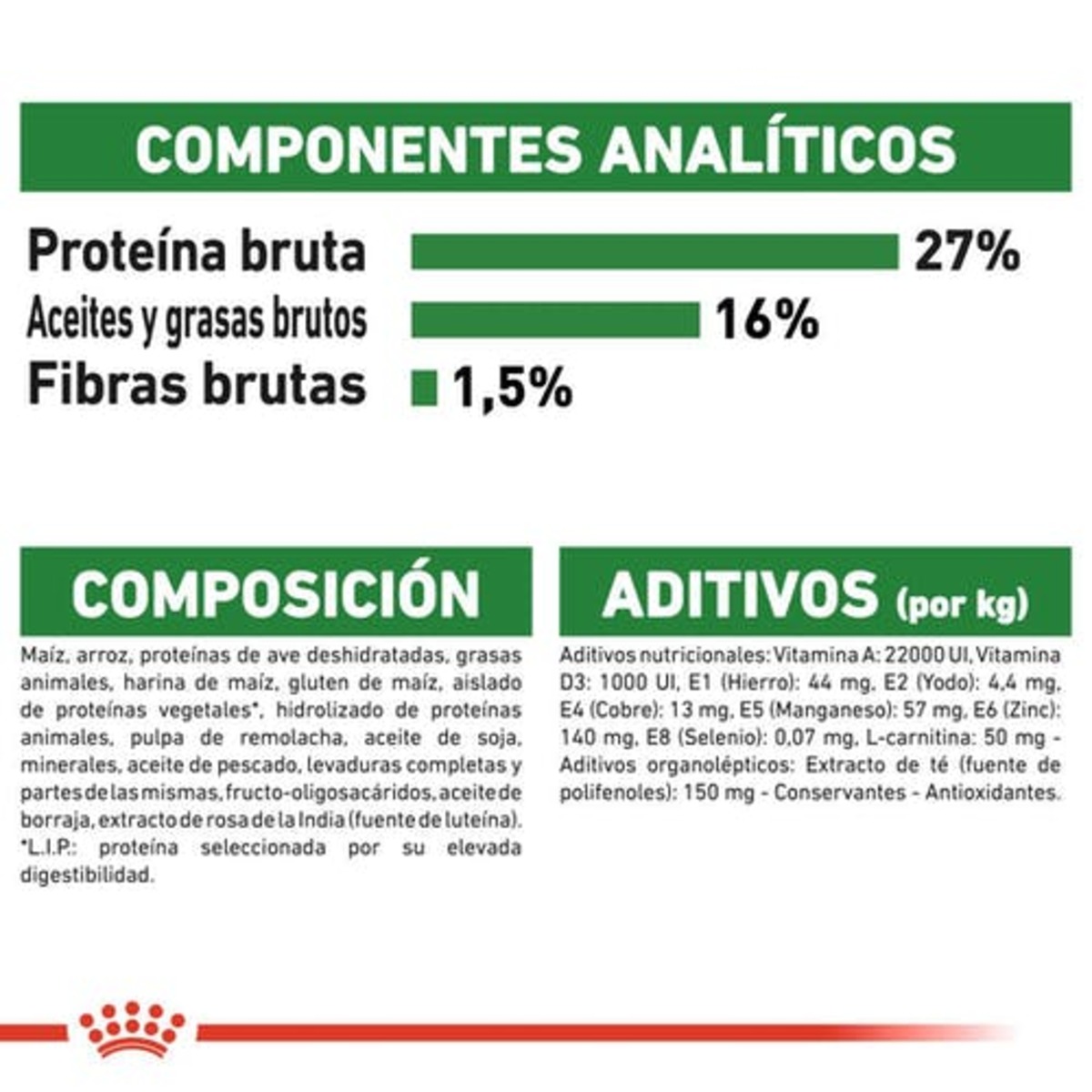 Composición: maíz, arroz, proteínas de ave deshidratadas, grasas animales, harina de maíz, gluten de maíz, aislado de proteínas vegetales*, hidrolizado de proteínas animales, pulpa de remolacha, aceite de soja, minerales, aceite de pescado, levaduras completas y partes de las mismas, fructo-oligosacáridos, aceite de borraja, extracto de rosa de la India (fuente de luteína).