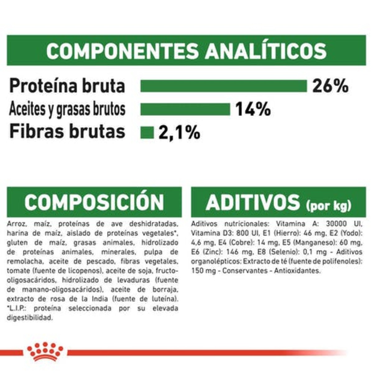 Composición: arroz, maíz, proteínas de ave deshidratadas, harina de maíz, aislado de proteínas vegetales*, gluten de maíz, grasas animales, hidrolizado de proteínas animales, minerales, pulpa de remolacha, aceite de pescado, fibras vegetales, tomate (fuente de licopenos), aceite de soja, fructo-oligosacáridos, hidrolizado de levaduras (fuente de manano-oligosacáridos), aceite de borraja, extracto de rosa de la India (fuente de luteína).