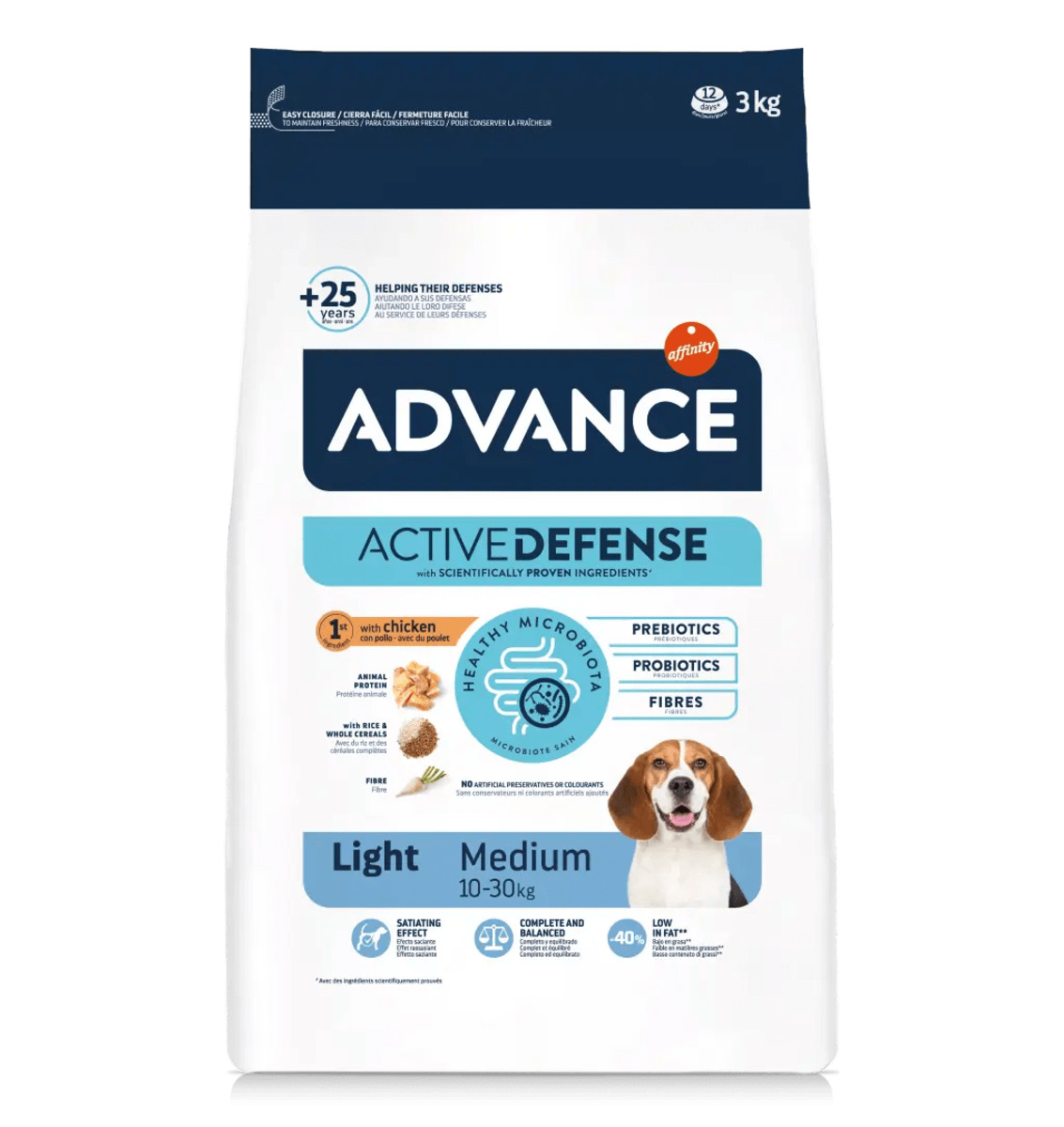 ADVANCE Light Medium es un alimento de alta gama especialmente indicado para perros de razas medianas (de 10 a 30 kg) con sobrepeso y tendencia a la obesidad.