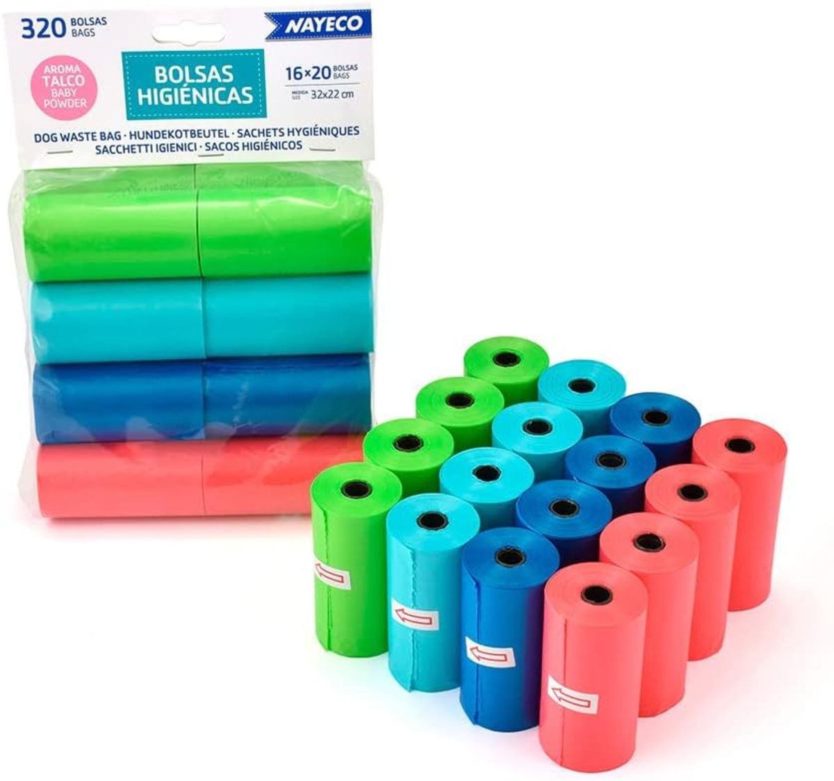 Bolsas recoge excrementos indispensables para salir a pasear con nuestra mascota. Se pueden usar como guante para recoger las heces con facilidad, de forma rápida y limpia sin dejar residuos. Pack de 16 rollos con 20 bolsas cada uno. com aroma a talco.Bolsas higiénicas de colores surtidos. Fabricado con plástico de buena calidad.