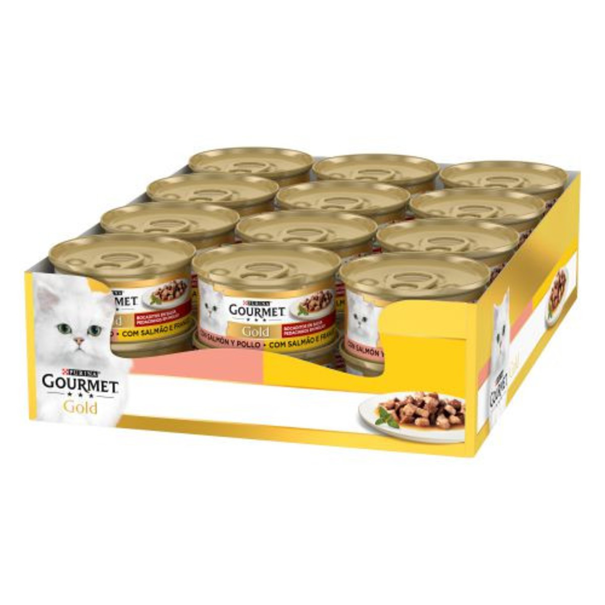 Caja de 24 Unidades Gourmet Gold Delicias de Salmón y Pollo, 85 g