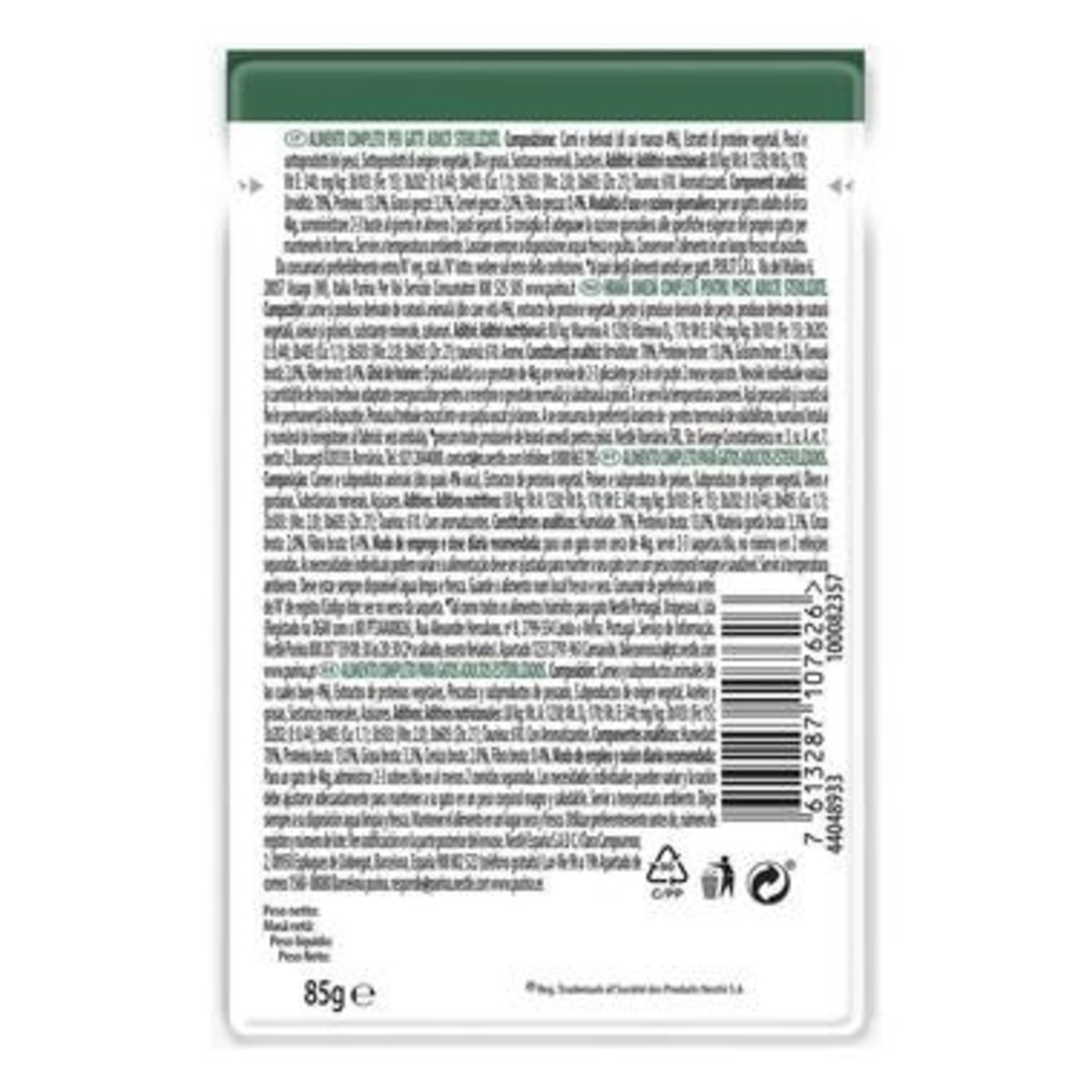 Comida húmeda completa para gatos esterilizados con tiernos trozos de buey en salsa.