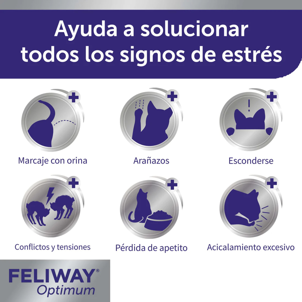 El Nuevo Complejo de Feromonas Felinas de FELIWAY Optimum contiene lo mejor de las feromonas felinas para una eficacia mejorada. Ayuda a los gatos en más situaciones y reduce de forma visible más signos de estrés. Asegúrate de proporcionarle un apoyo continuo a tu gato usando un recambio cada mes y renovando el difusor cada 6 meses.