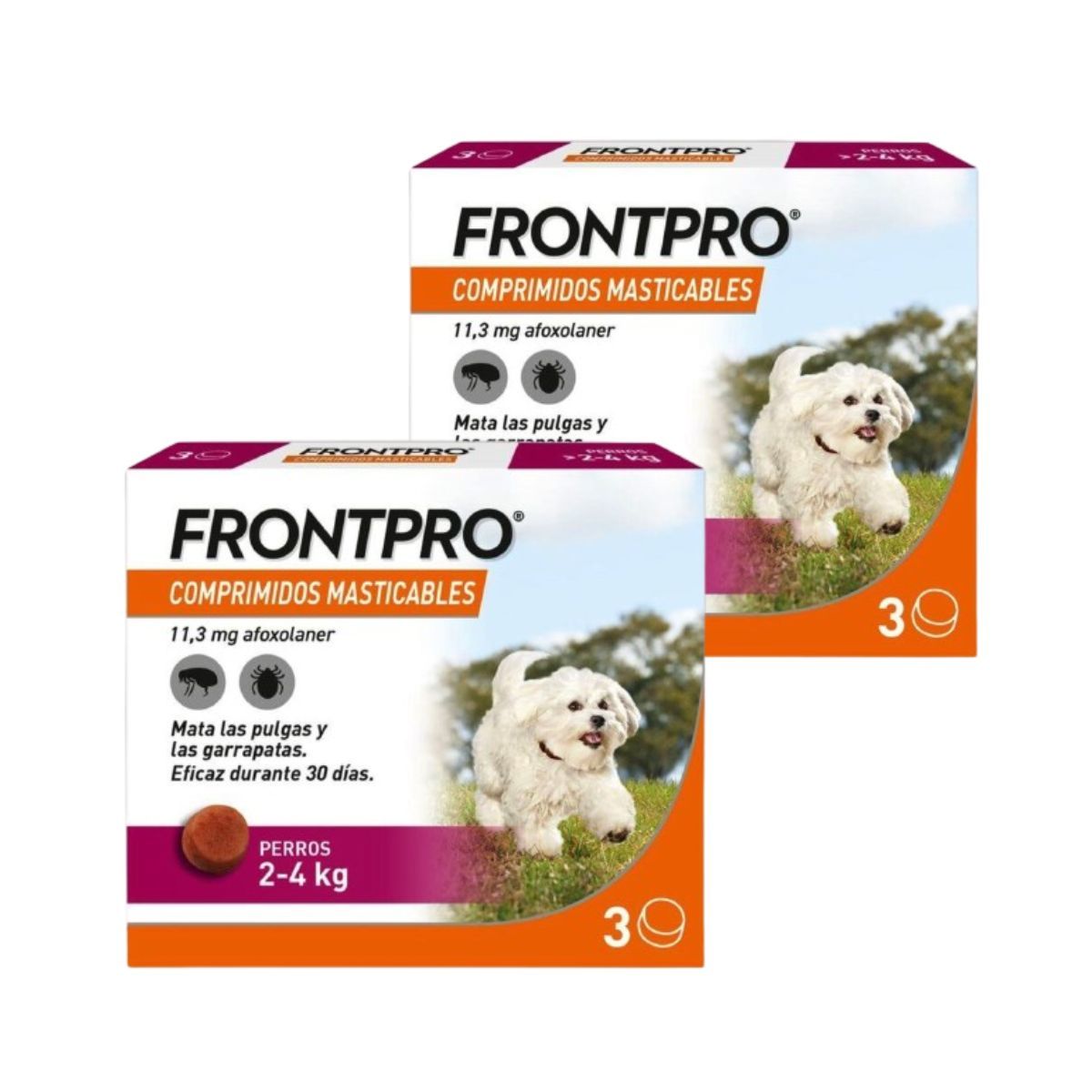 Frontpro Masticable 11 mg es un medicamento veterinario en formato de tabletas masticables, diseñado para la prevención y el tratamiento de infestaciones por pulgas y garrapatas en perros de 2-4 kg de peso. Cada paquete contiene 3 comprimidos.