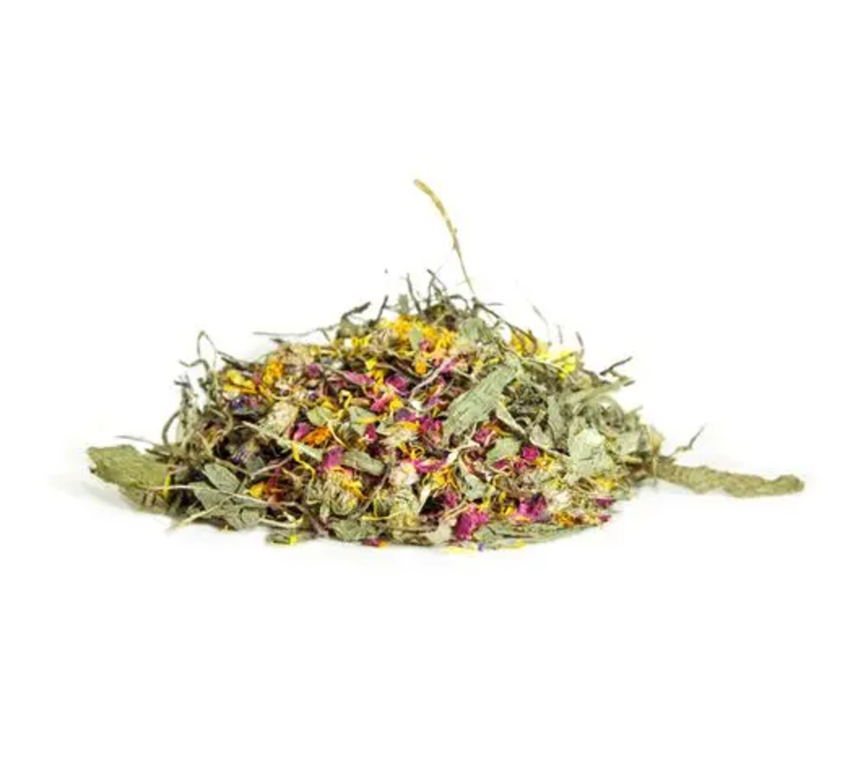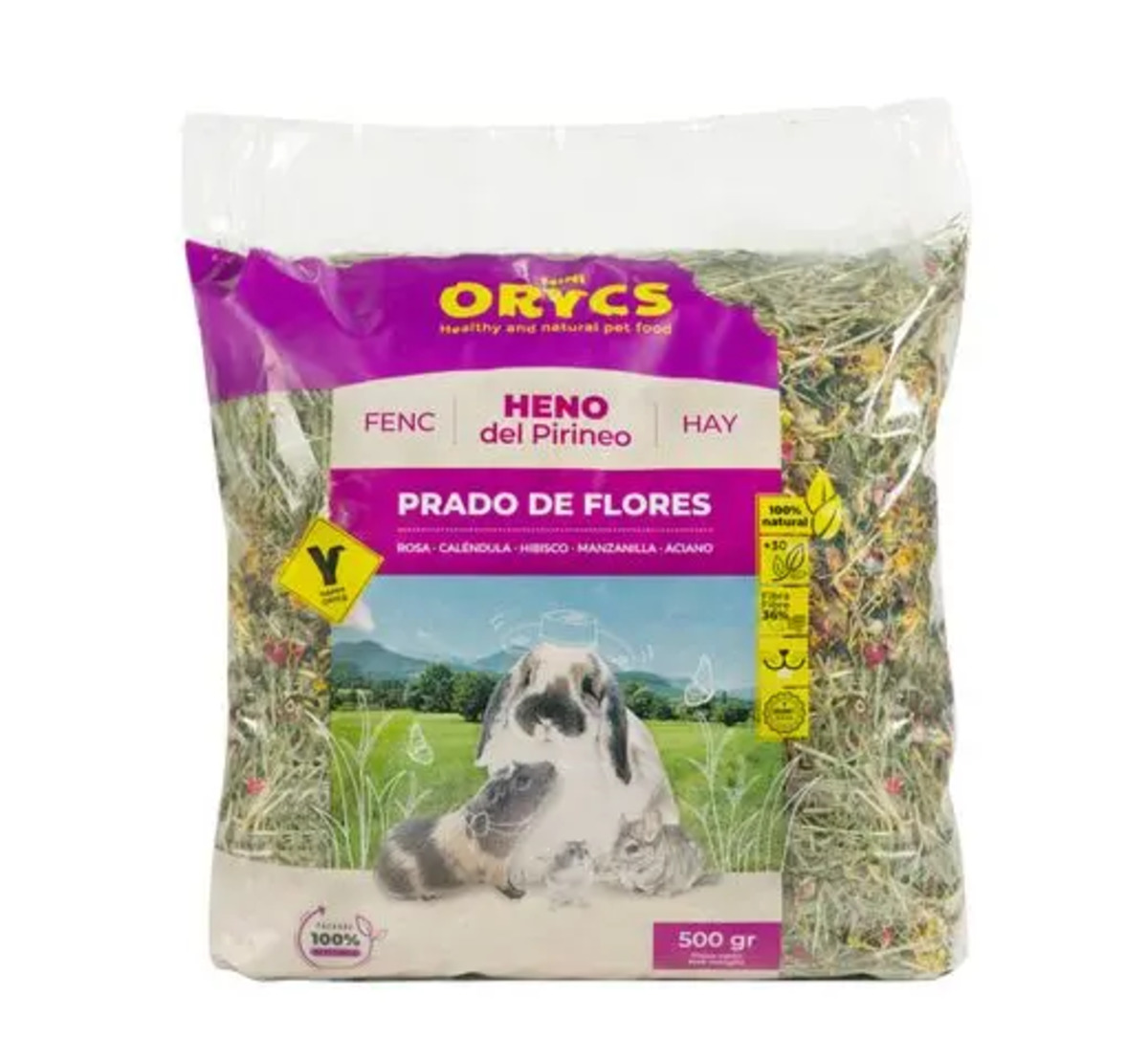Heno del Pirineo con pétalos de rosa, muy útiles para mejorar el tránsito intestinal. También actúan como antioxidante y relajante. Y diente de león que contribuye a tener unos huesos saludables y un pelaje suave y brillante gracias a su contenido en hierro, ácido fólico y vitamina A y C.