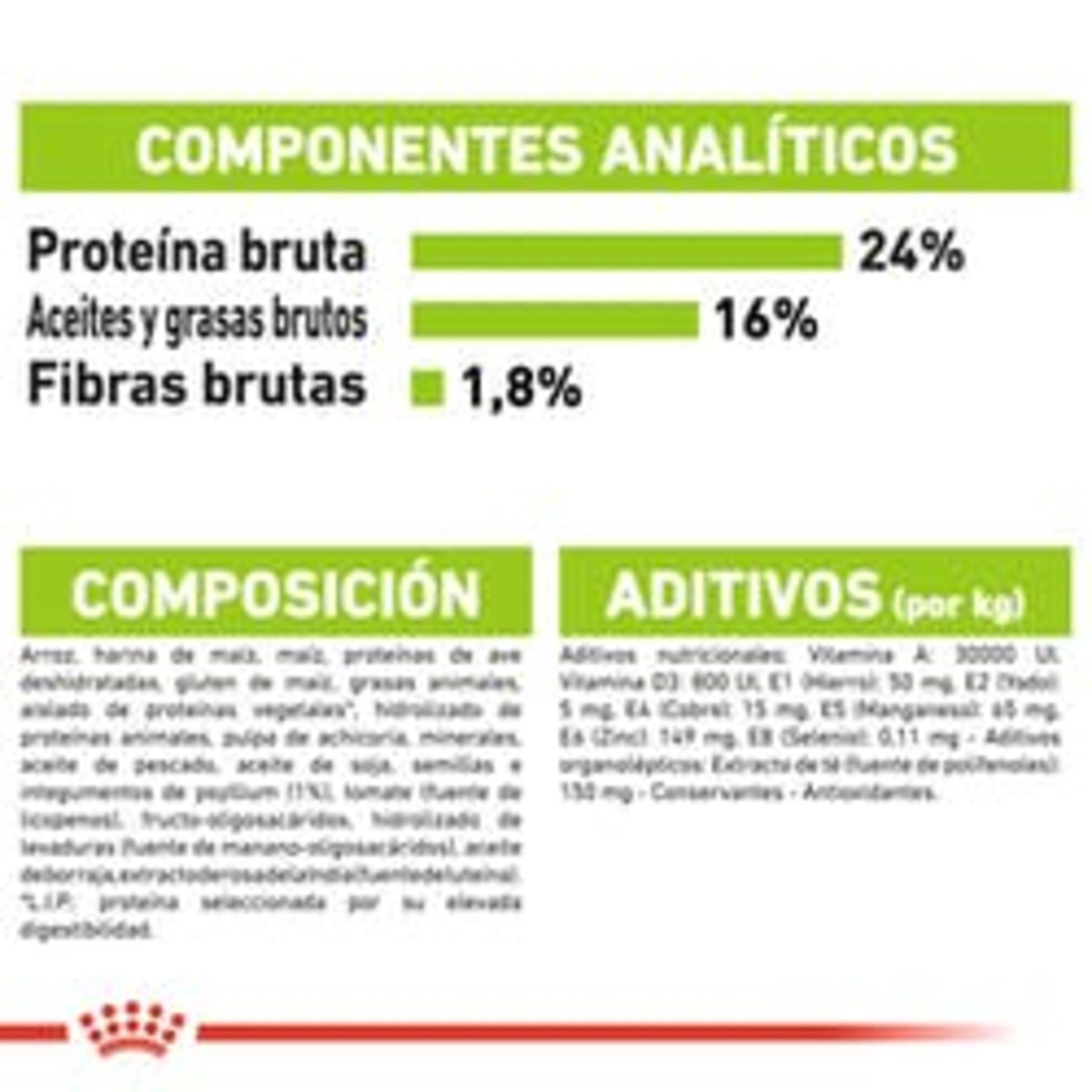 Arroz, harina de maíz, maíz, carne de ave deshidratada, grasas animales, gluten de maíz, aislado de proteínas vegetales LIP (proteína seleccionada por su elevada asimilación), hidrolizado de proteínas animales, pulpa de achicoria, minerales, aceite de pescado, aceite de soja, tomate deshidratado (fuente de licopeno), integumentos y semillas de psyllium (1%), fructooligosacáridos, hidrolizado de levaduras (fuente de manano-oligosacáridos), aceite de borraja, extractos de té verde y de uvas (fuente de polifenoles) y extracto de rosa de la India (fuente de luteína).
