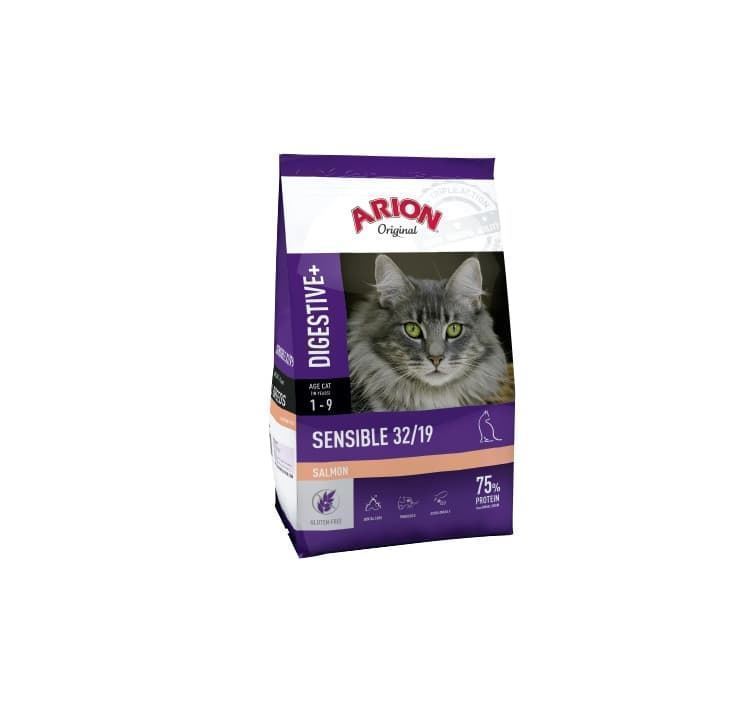 Aliment sec pour chats avec système digestif sensible, élaboré avec des ingrédients facilement digestibles, sans gluten ni OGM et sans additifs inutiles, avec saumon et poulet déshydratés, riz et huile de poisson pour un soutien digestif supplémentaire.
